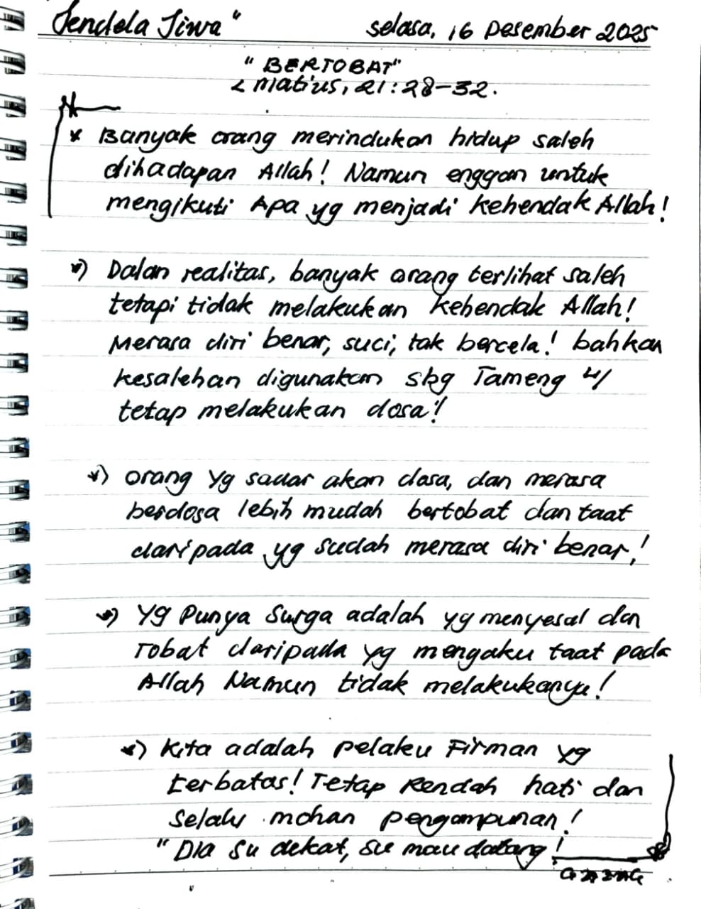 Dalam realitas, banyak orang terlihat saleh tetapi tidak melakukan kehendak Allah! merasa diri benar, suci, tak bercela! bahkan kesalehan digunakan sbg tameng u/ tetap melakukan dosa!